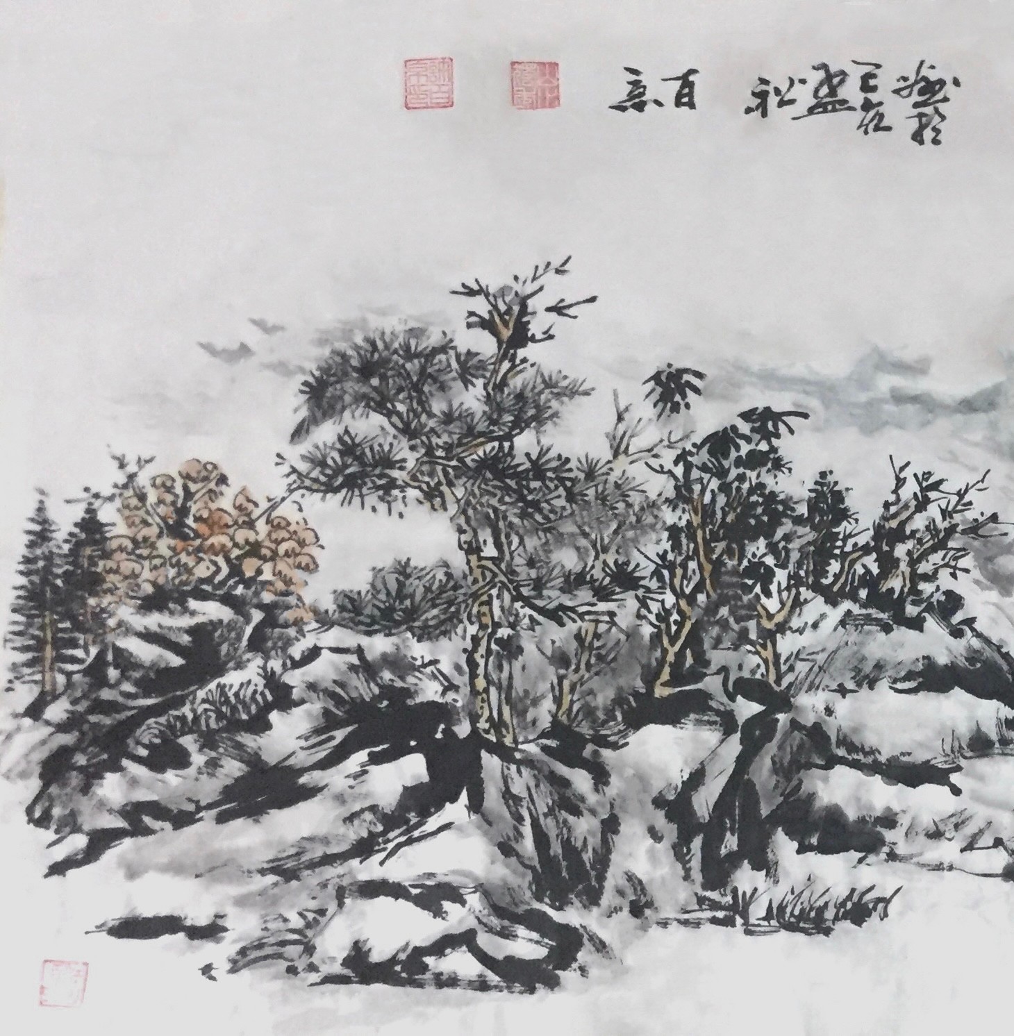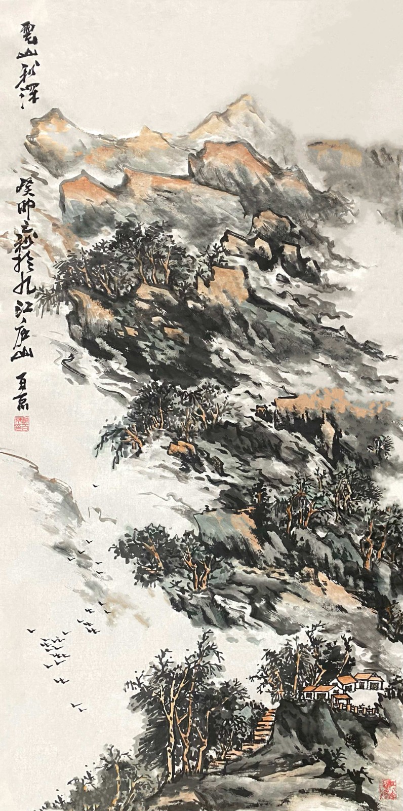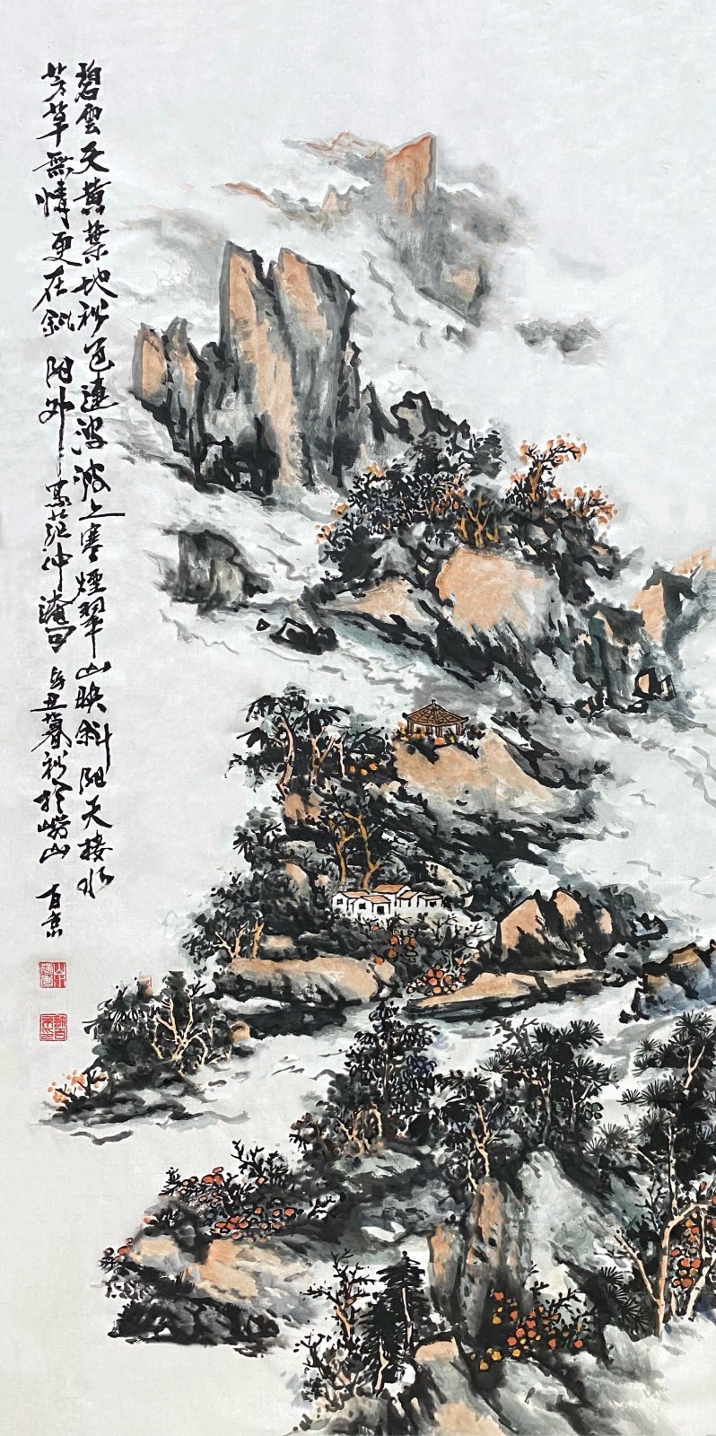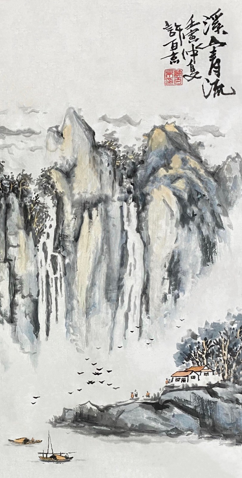 许百京的山水画艺术,最突出的特点是"古代传统与现代结合"的创新理念。观其代表作《秋天清晓图》《溪山晴远图》《高山流水》等,可以清晰地看到这种创新轨迹——在构图上,他打破了传统山水"三远法"的固定模式,引入现代构成意识;在笔墨上,他保留了中国画"骨法用笔"的精髓,又融入了西画的明暗表现;在意境上,他既追求"可游可居"的传统山水理想,又赋予作品现代人的精神寄托。
