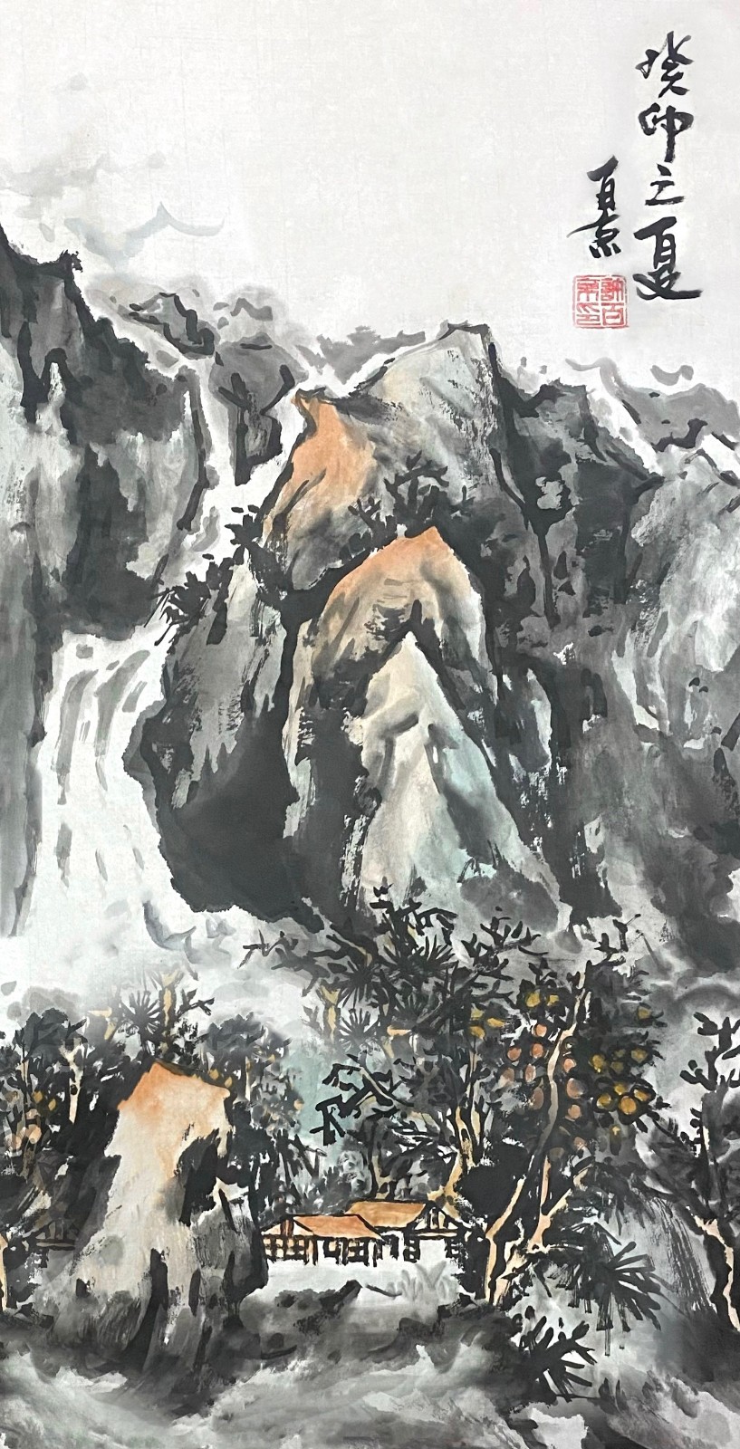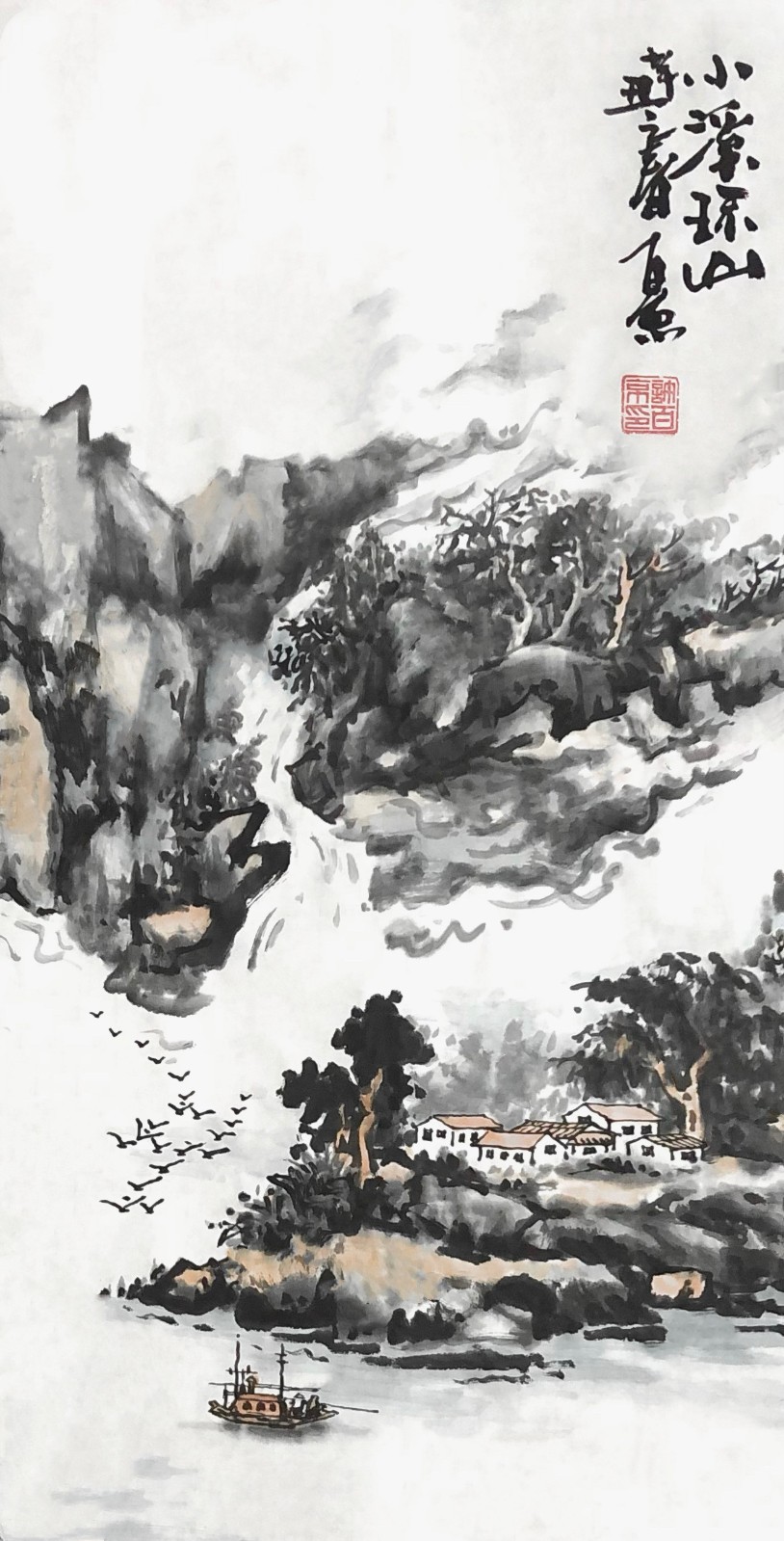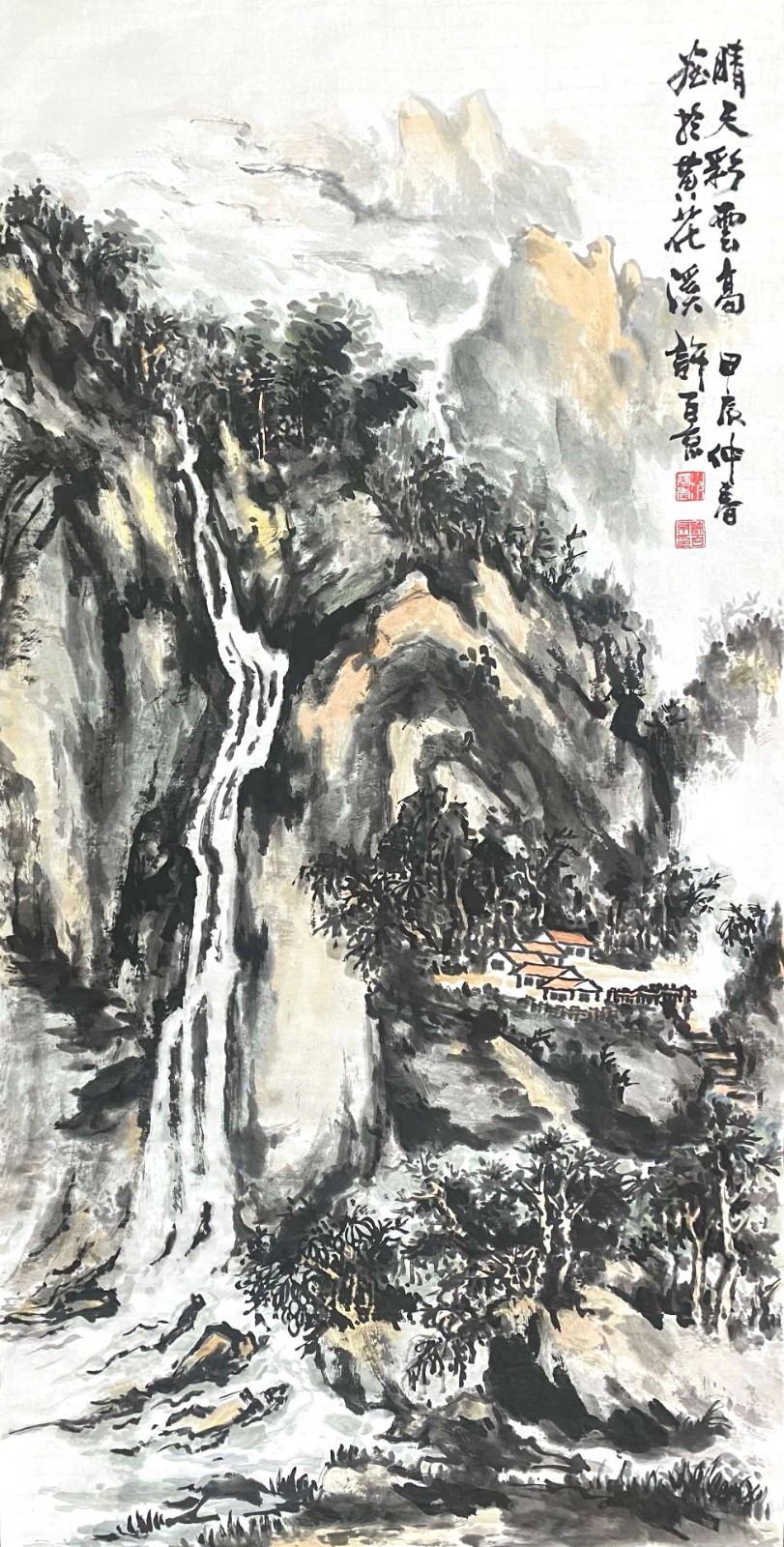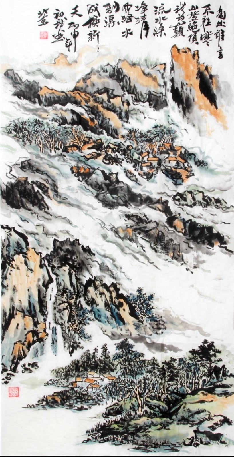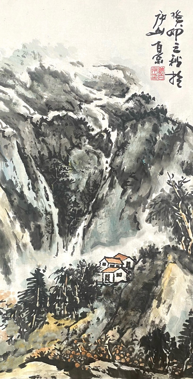 许百京的山水画艺术,最突出的特点是"古代传统与现代结合"的创新理念。观其代表作《秋天清晓图》《溪山晴远图》《高山流水》等,可以清晰地看到这种创新轨迹——在构图上,他打破了传统山水"三远法"的固定模式,引入现代构成意识;在笔墨上,他保留了中国画"骨法用笔"的精髓,又融入了西画的明暗表现;在意境上,他既追求"可游可居"的传统山水理想,又赋予作品现代人的精神寄托。