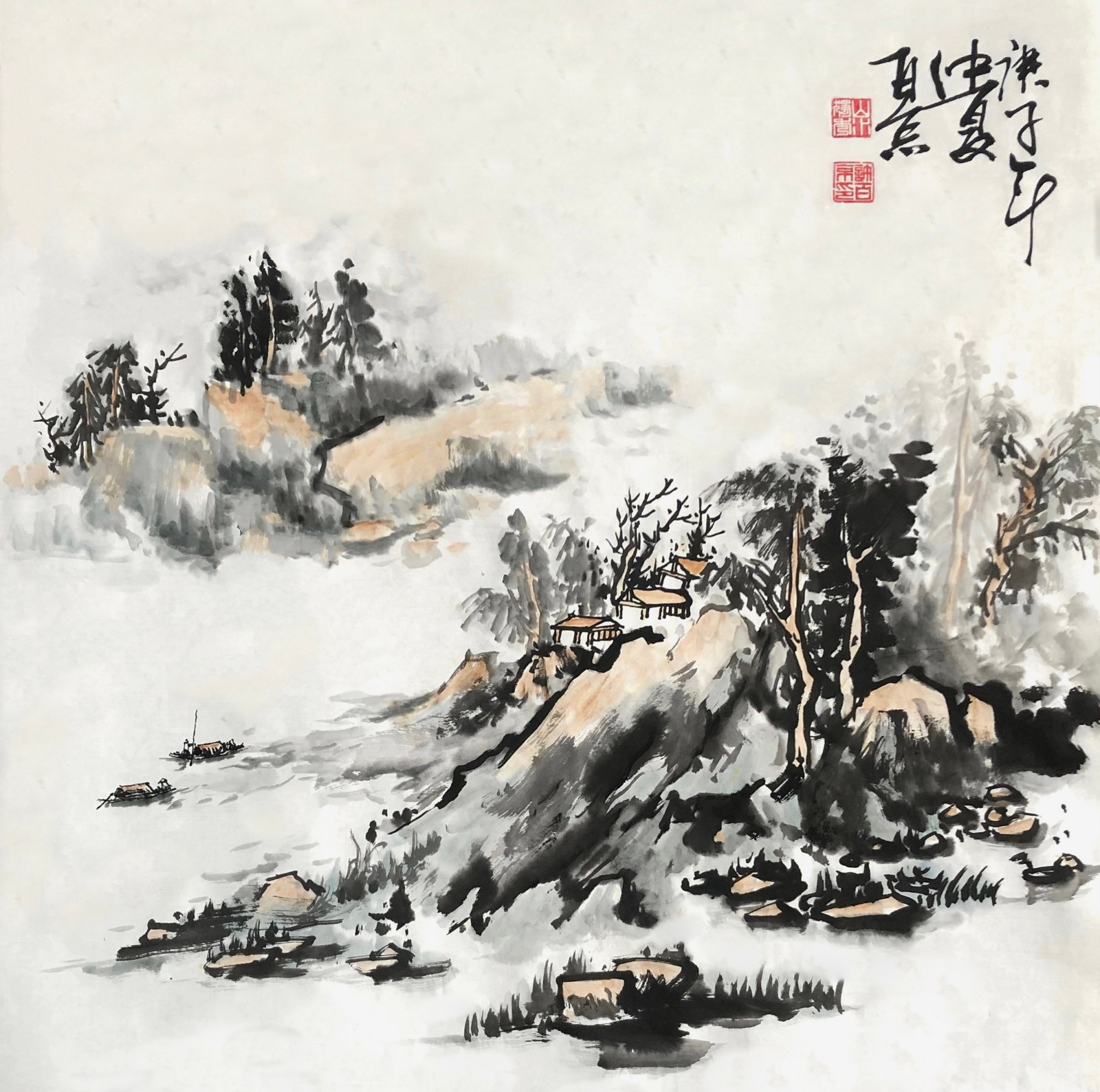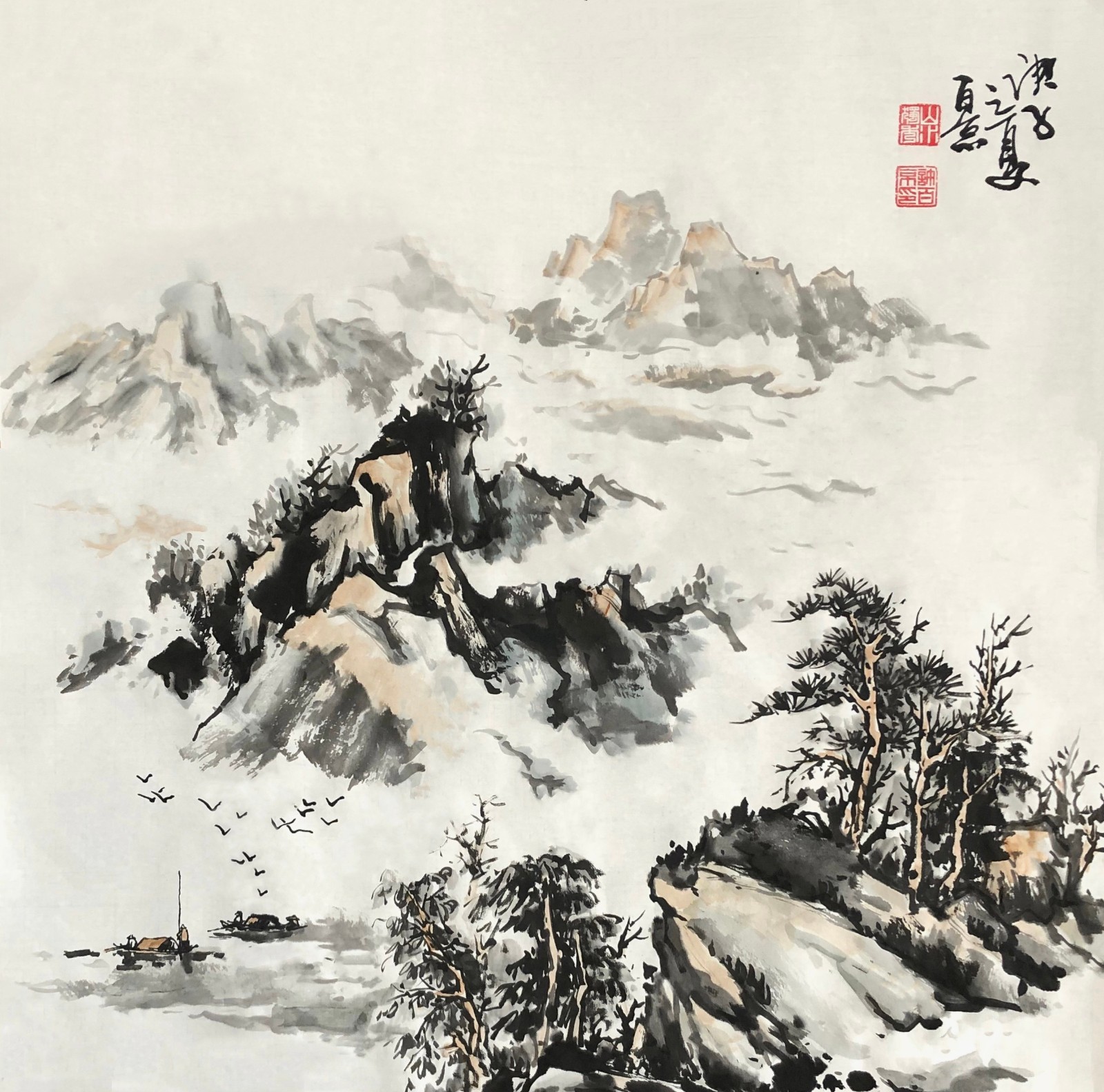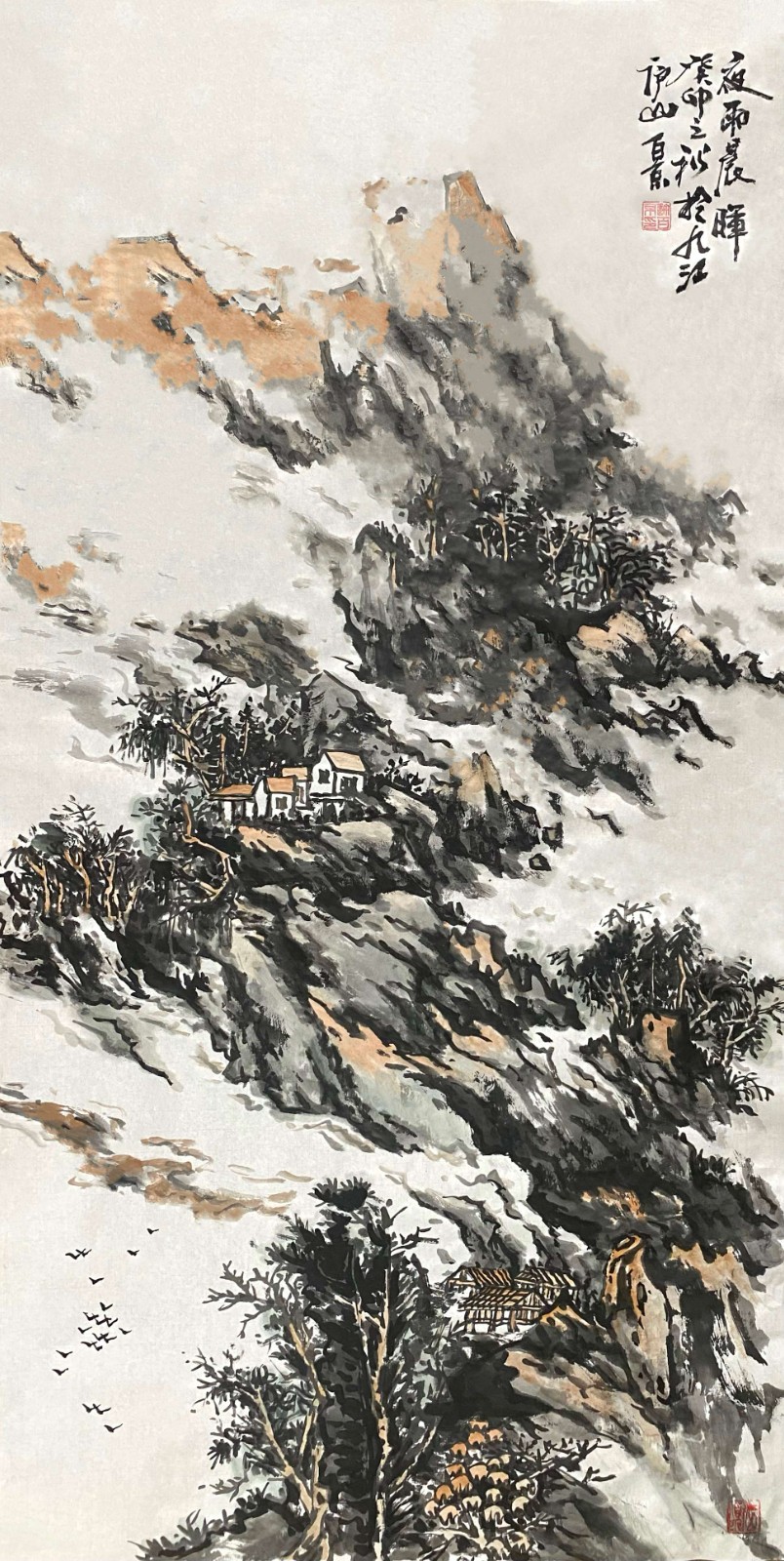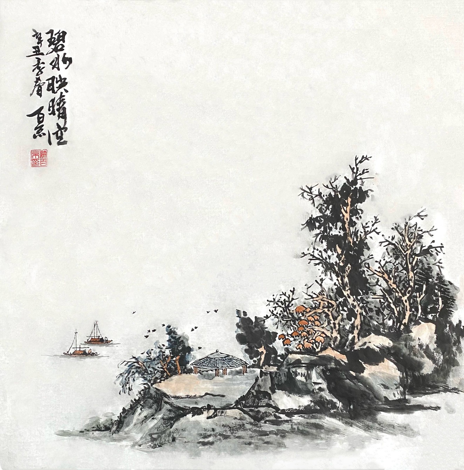 许百京的山水画艺术,最突出的特点是"古代传统与现代结合"的创新理念。观其代表作《秋天清晓图》《溪山晴远图》《高山流水》等,可以清晰地看到这种创新轨迹——在构图上,他打破了传统山水"三远法"的固定模式,引入现代构成意识;在笔墨上,他保留了中国画"骨法用笔"的精髓,又融入了西画的明暗表现;在意境上,他既追求"可游可居"的传统山水理想,又赋予作品现代人的精神寄托。