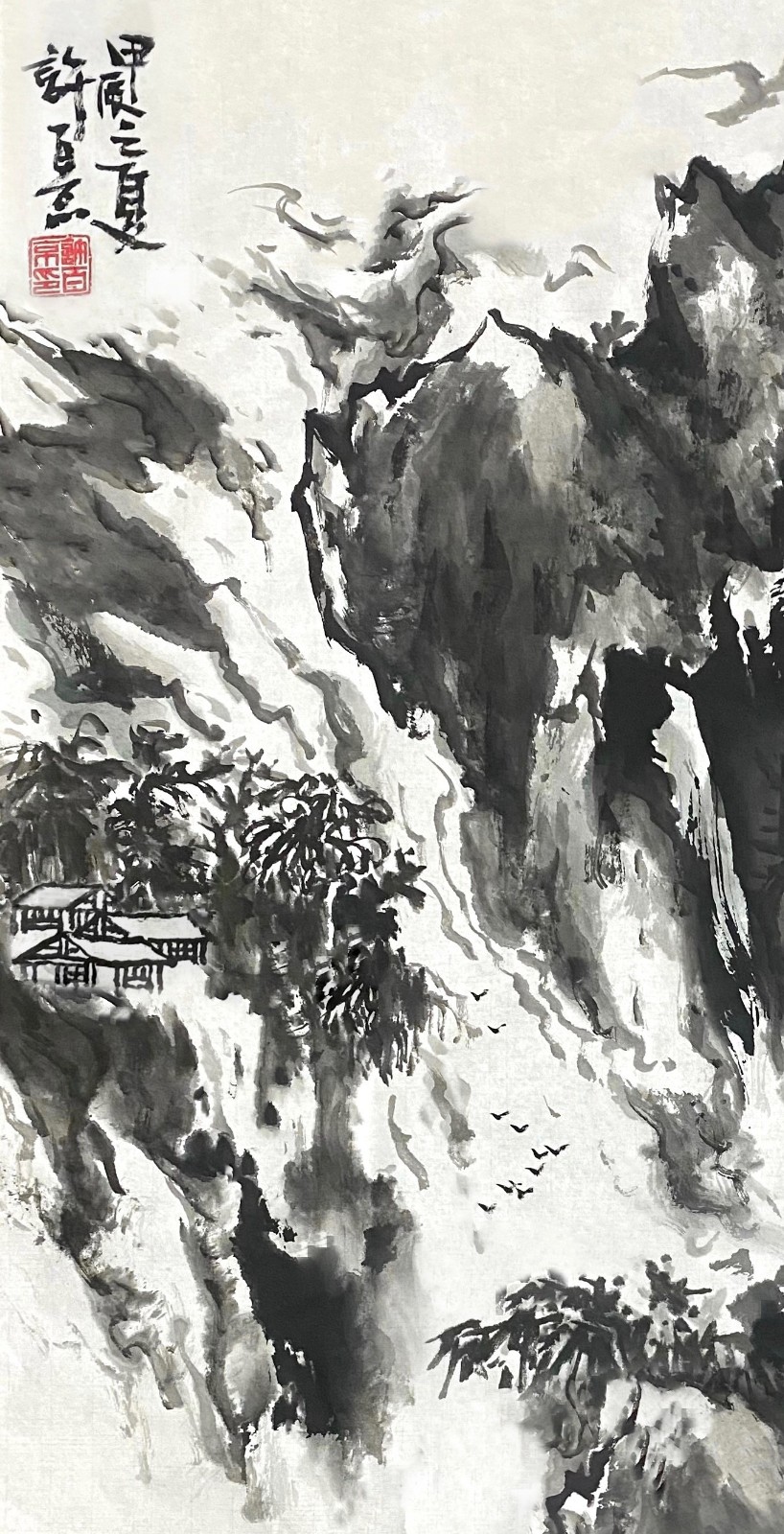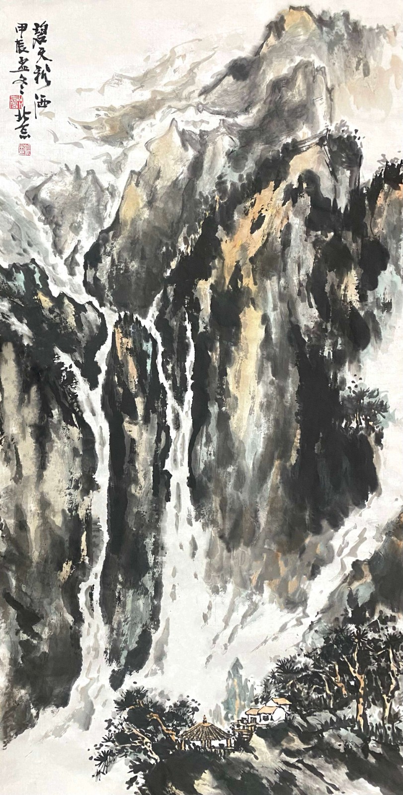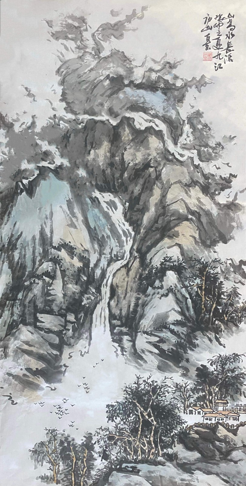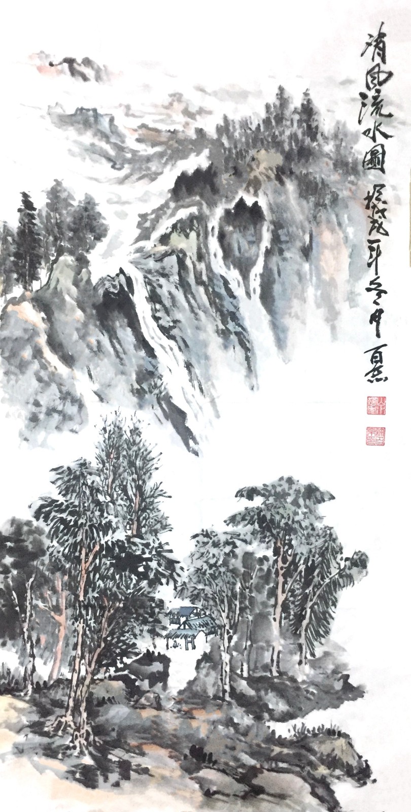这种创新不是无源之水、无本之木,而是建立在对传统的深刻理解之上。许百京曾言:"创新必须先有传承,就像树要有根才能长得高。"他的《高山清风流水图》便是明证——画面中,传统皴法的运用炉火纯青,但整体气息却充满现代感;山石的塑造遵循古法,但空间处理却富有当代性。这种"旧瓶装新酒"的艺术创造,使他的作品既有历史的厚重感,又有时代的鲜活气息。