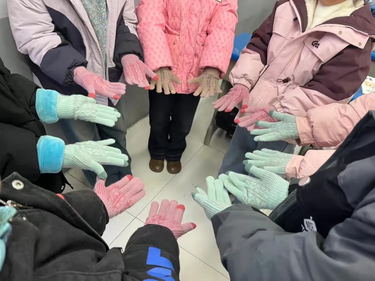 返回教室后,孩子们按捺不住心中的激动,立刻戴上了新手套。有的同学三五成群,相互展示着自己的五彩手套;有的则高高举起小手,比出各种俏皮可爱的姿势。粉嫩、浅紫、宝蓝等各色手套在教室里交织,宛如一片充满暖意的彩色海洋。还有不少孩子跑到户外,戴着新手套比出象征胜利的 “V” 字手势,灵动的模样与鲜艳的手套相映成趣,定格下一个个满是童趣与幸福的美好瞬间。