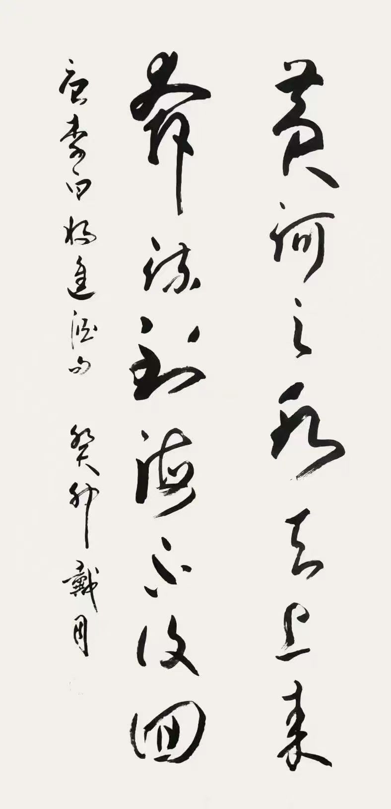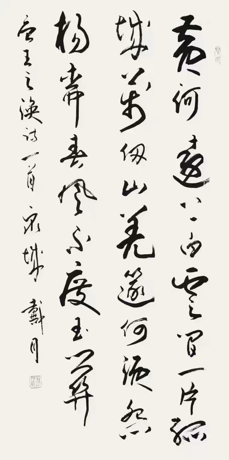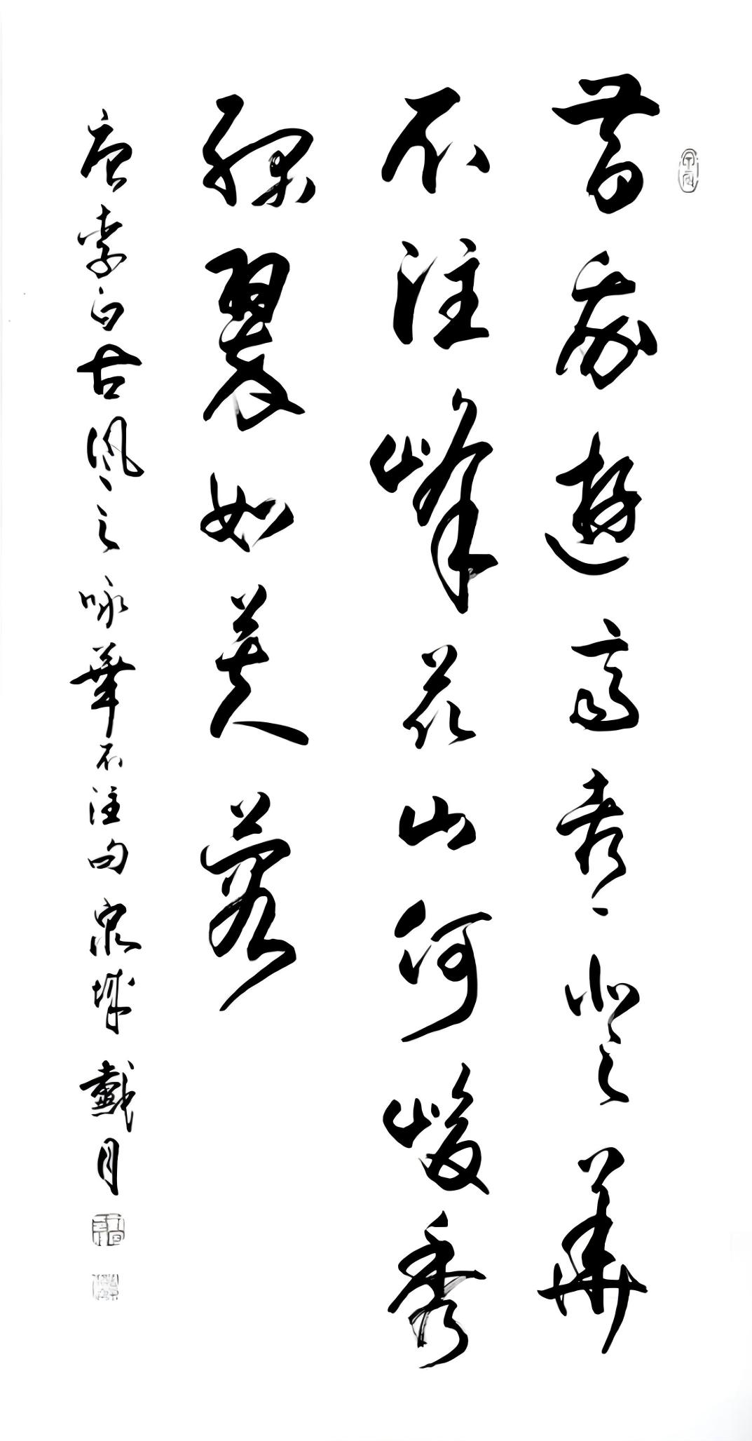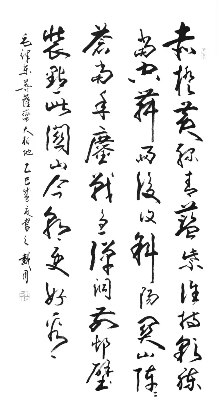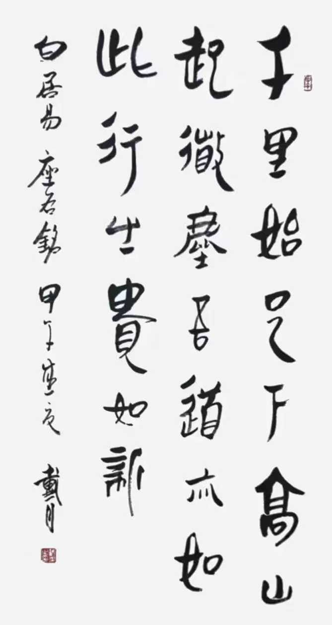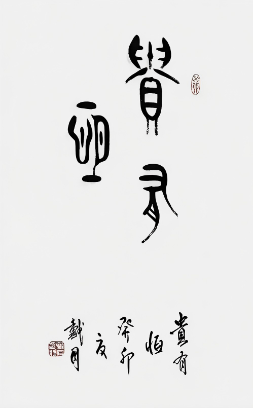 为了实现艺术突破,戴月开始尝试将古文字与现代书法审美相结合。他在金文书法创作中,运用现代书法的构图理念与笔墨技巧,使古老的金文焕发出新的生机与活力。例如,在笔画的粗细变化上,他打破了传统金文相对均匀的笔画特点,通过强烈的对比,增强了作品的视觉冲击力;在构图方面,他借鉴现代书法的空间布局,使金文在画面中的排列更加富有节奏感与韵律美。