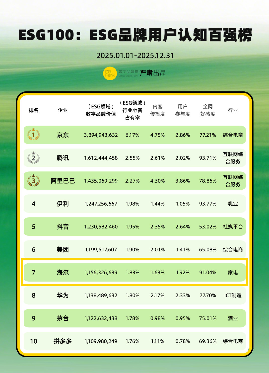 ESG100品牌榜作为国内ESG领域企业评估的权威榜单之一,评选依据以全网媒体报道与用户口碑为数据基础,客观反映企业在ESG领域受用户心智认可程度的排名,也对企业在ESG声誉建设成果进行专业量化评估。本次榜单上,除了ESG品牌用户认知百强榜总榜以外,海尔也在文化保护与传承、气候变化与碳排放、污染与废弃物管理多个细分榜单中,进入行业TOP10,全面展现了作为平台服务型科技生态企业在ESG领域的系统布局与领先实力。